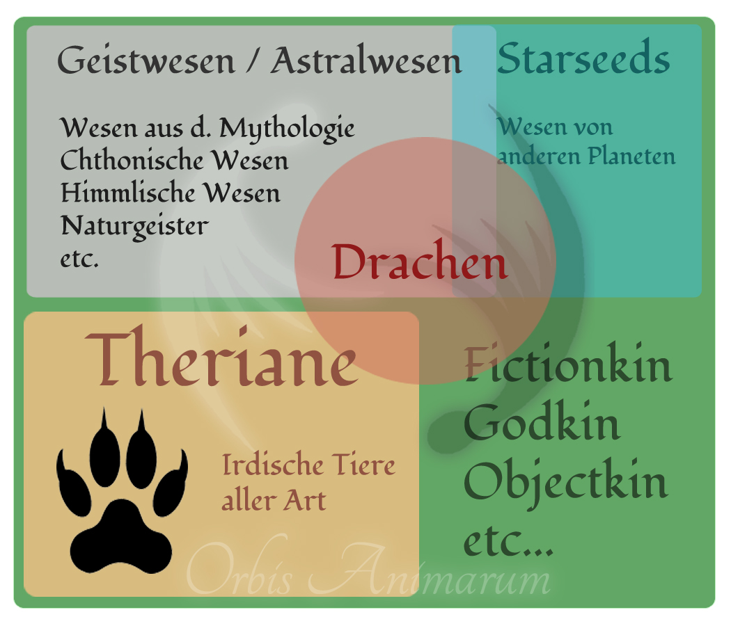 Drachen sind in gewisser Weise ein eigenes Gebiet. Nicht nur, weil sie wie Theriane recht eigenbrötlerisch unterwegs sind und teilweise eigene Begriffe und Definitionen haben, sondern auch, weil sich eine Vielzahl verschiedener Wesensarten unter diesem Terminus vereinigt, der sich dadurch mit allen anderen Gruppen überschneidet. Östliche Drachen fallen beispielsweise unter Naturgeister, da sie Gewässer-Gottheiten sind. Westliche Drachen fallen gemeinhin unter mythologische Wesen, allerdings gibt es auch Personen, die der Meinung sind, dass Drachen physisch existiert haben. Es gibt Überlegungen, ob diese Annahme auf Dinosaurier-Inkarnations-Erinnerungen beruht, womit sie unter Theriane fallen würden. Zudem gibt es Personen mit der Auffassung, dass drachenartige Wesen auf anderen Planeten existieren (physisch oder astral) und begründen ihre Identifikation darauf. Drachen sind insgesamt (wohl auch wegen der vielen verschiedenen Wesensarten, die der Begriff vereint), eine der häufigsten vertretenen Otherkin-Arten.